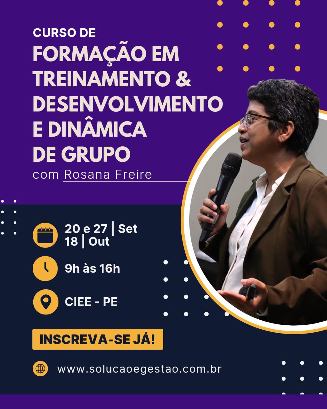 Neste curso Rosana Freire, CEO da Solução e Gestão, irá compartilhar sua metodologia, criada durante seus 25 anos de carreira, com o intuito de habilitar os participantes para fomentar Programas de Treinamento & Desenvolvimento e aplicação do estudo da Dinâmica de Grupo, alinhados ao negócio, bem como a serem instrutores de treinamento.